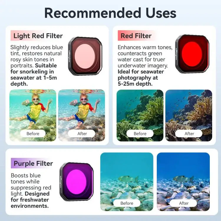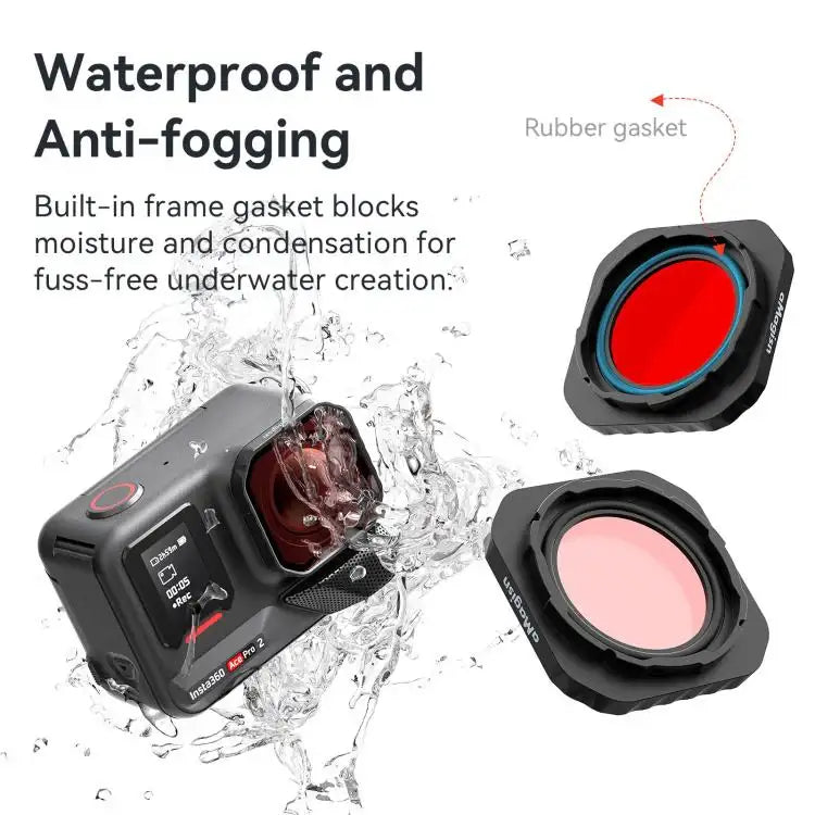 Med dette Ace Pro 2-filter kan du effektivt korrigere farveskift, der opstår på forskellige vanddybder. Filteret hjælper med at genskabe naturlige farver, hvilket resulterer i mere realistiske og tiltalende billeder. Dette Insta360-undervandsfilter er nemt at anvende og giver øjeblikkelige resultater for dit actionkamera. Sørg for, at dit Insta360 Ace Pro 2-filter giver dig de bedst mulige billeder.Robust beskyttelse og vandtæt kameralinse